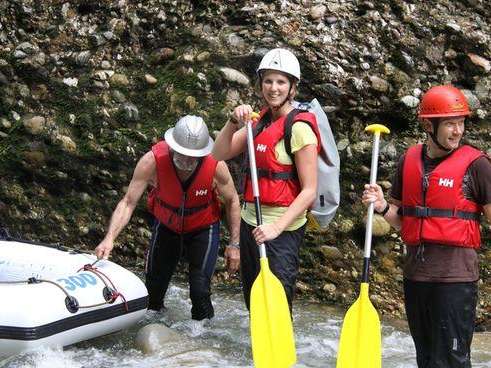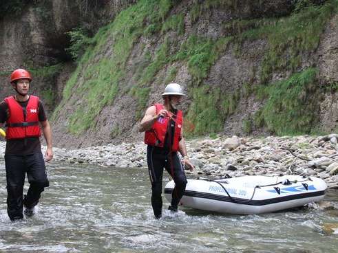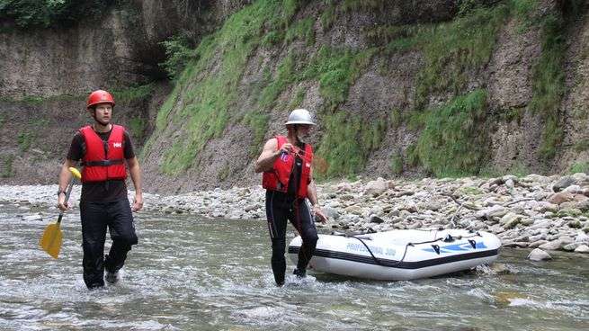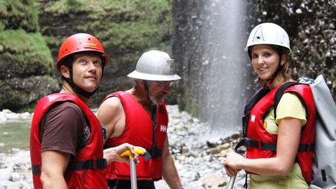 - Velo-Helm oder Kletterhelm, Badekleider, darüber eine Regenhose als Beinschutz, T-Shirt, evtl. leichte Regenjacke, Wasserschuhe zum binden (oder alte Turnschuhe), trockene Kleidung.