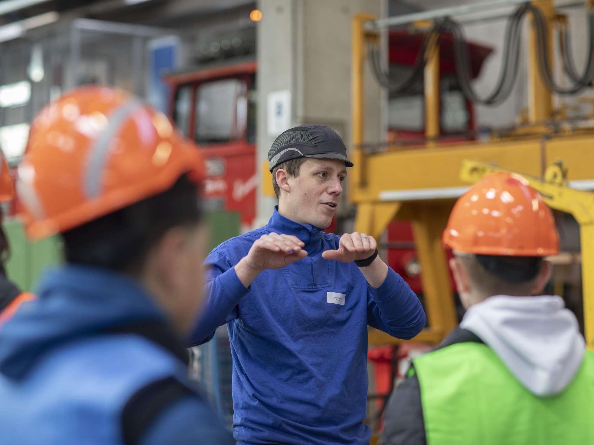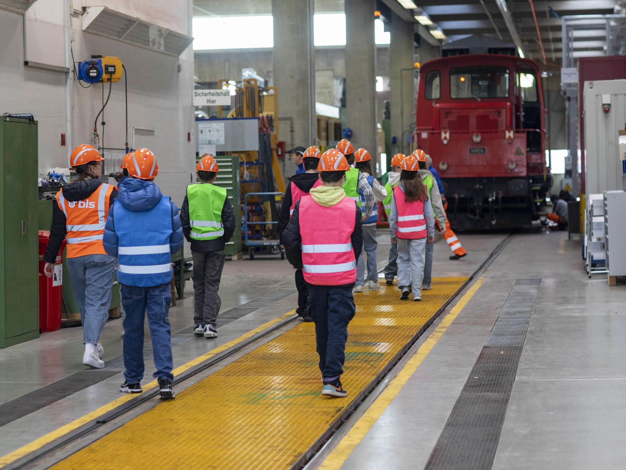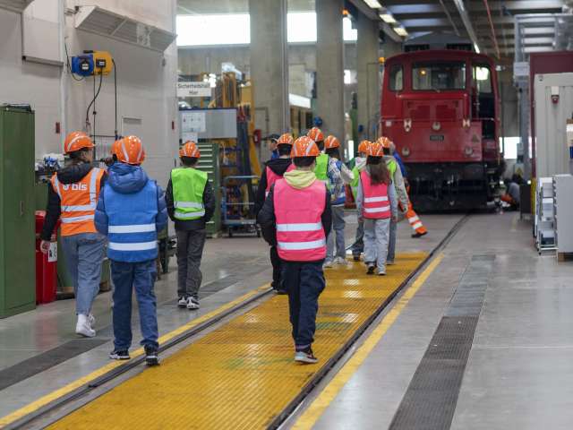 Direkt ab dem Bahnhof Oberburg führen die BLS-Lernenden die Schulklasse durch die Werkstatt und geben ihr einen Einblick in die verschiedenen Berufslehren.