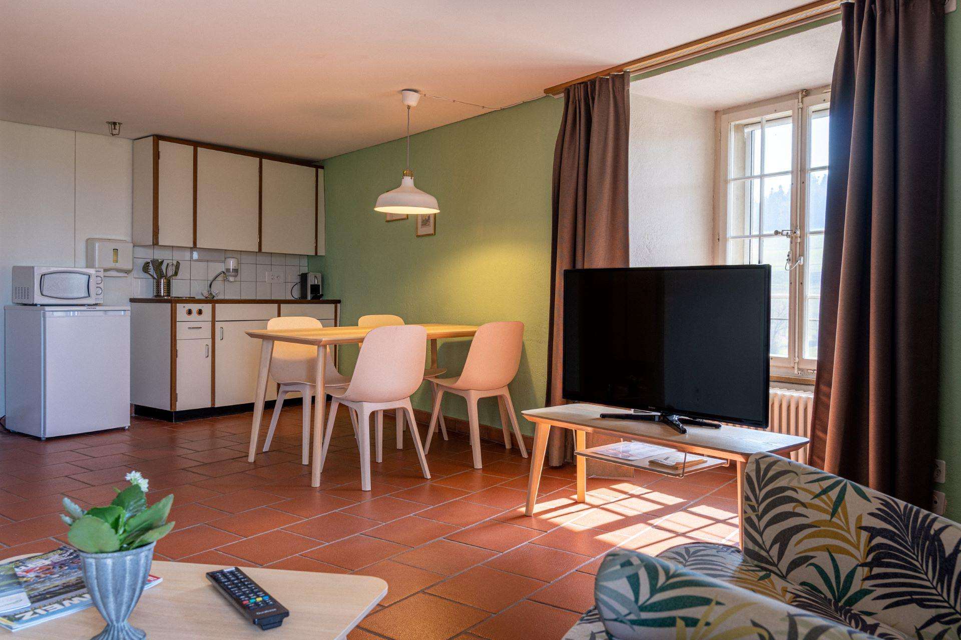 - Aufenthaltsraum inkl. Küche, Esstisch, Sitzecke und TV (Verfügbarkeit nicht garantiert)