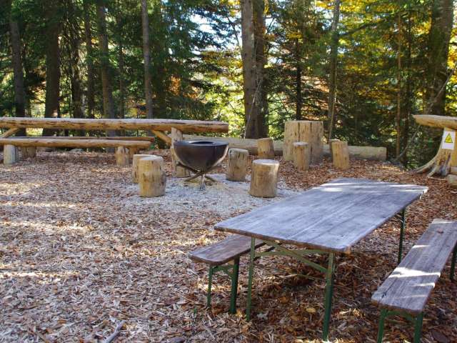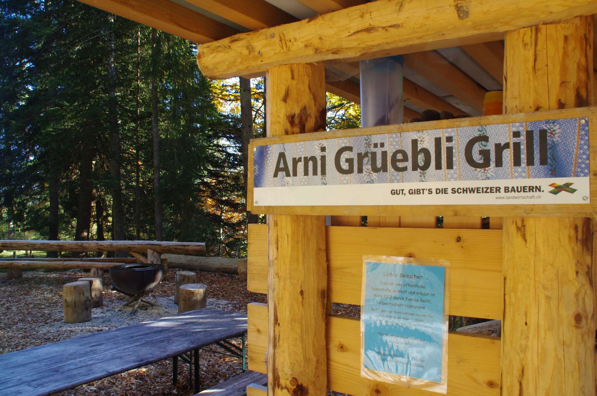 Etwas unterhalb hat die Wirtefamilie Reist eine wunderbare Feuerstelle gebaut. Beim modernen Stahlgrill stehen Tische und Bänke für rund 40 Personen. Zudem hat es einen grossen Unterstand mit Brennholz, Beil, Anzündhilfen und sogar Spielsachen für die Kleinen. Der Grill eignet sich übrigens auch für ein Waldfondue: Pfanne und lange Gabeln (jedoch kein Käse und Brot) können auf Vorbestellung direkt in der Alpwirtschaft bezogen werden.