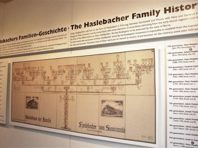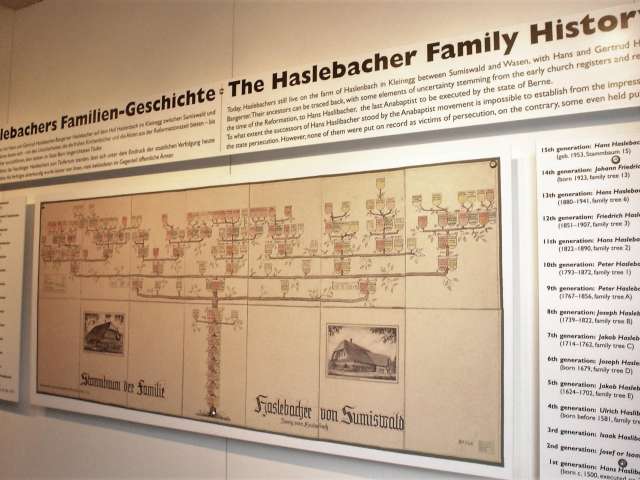 Seit 2007 befindet sich im Speicher eine familiengeschichtliche Ausstellung, die bis ins 16. Jahrhundert zurückführt. In dieser Zeit entstand die Täuferbewegung, ein dunkles Kapitel in der Schweizer Geschichte. Der Vorfahre der Familie, Hans Haslibacher, war ein Täufer und Täuferlehrer, aber die Obrigkeit duldete diese Glaubensgemeinschaften nicht und verfolgte diese Menschen bis aufs Blut. Bei einer Führung erfahren Sie mehr zu dieser Geschichte sowie einen kleinen Einblick in das Leben von Amischen in Amerika, welche den Glauben noch heute leben.