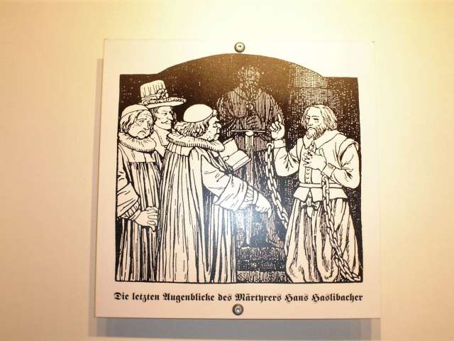 Auf dem Haslebacherhof wohnte der letzte Täufer, welcher 1571 von der Berner Regierung zum Tode verurteilt wurde. In einem Lied mit 32 Strophen wird berichtet, wie er «vom Leben zum Tod gerichtet» wurde. In dieser Ausstellung können im Raum «Schimpf und Schande» die Strophen zur Melodie des Haslebacher Liedes gelesen werden. Gegenüber im Bergfried von Schloss Trachselwald kann das Haslebacher Lied gesungen von Amischen gehört werden.