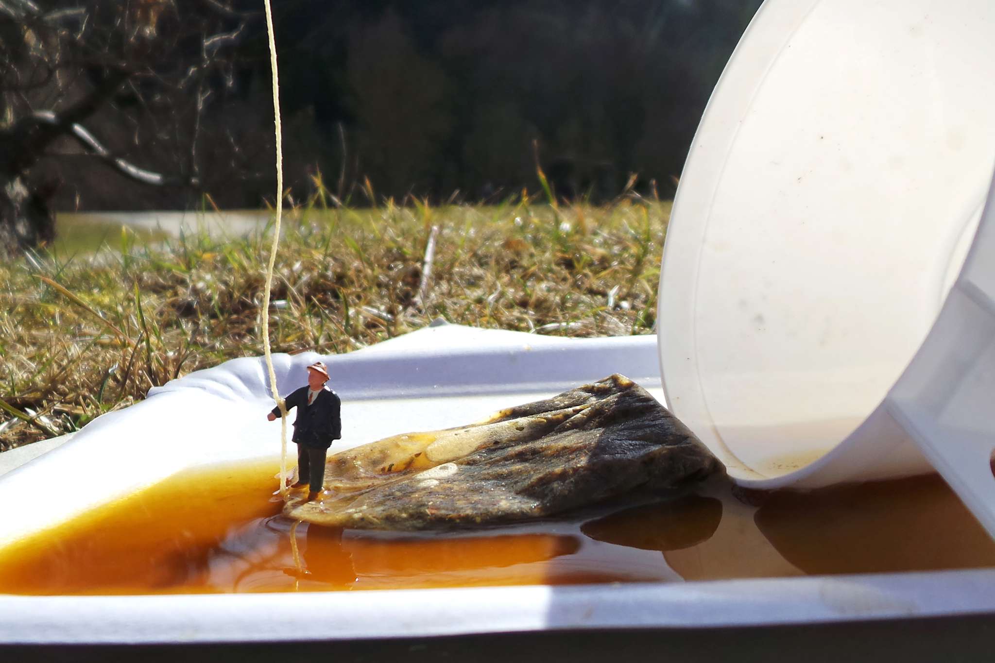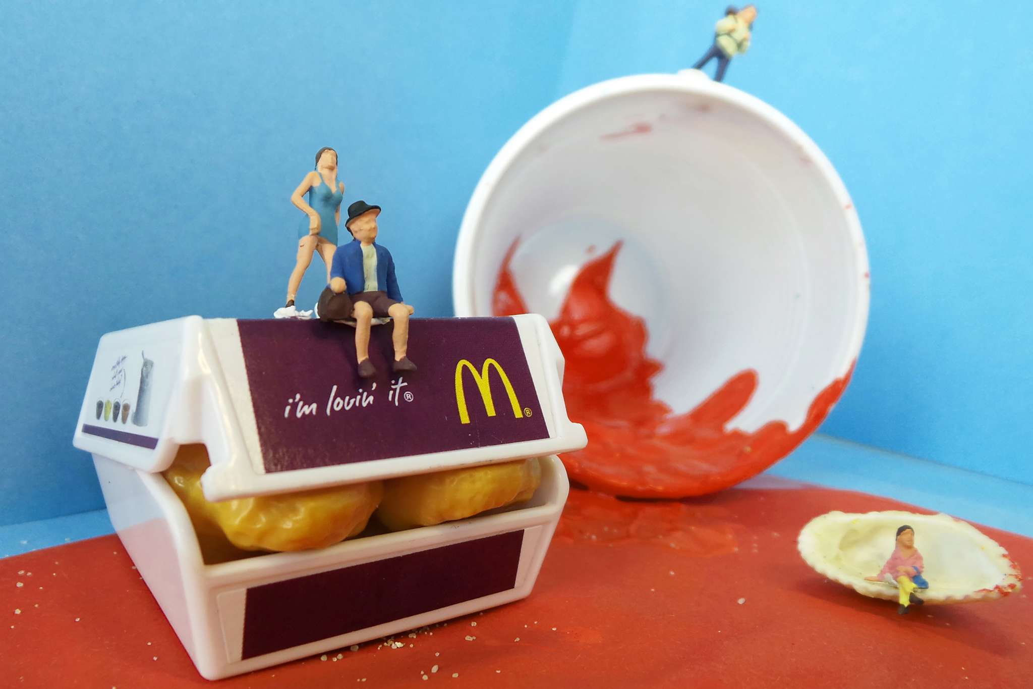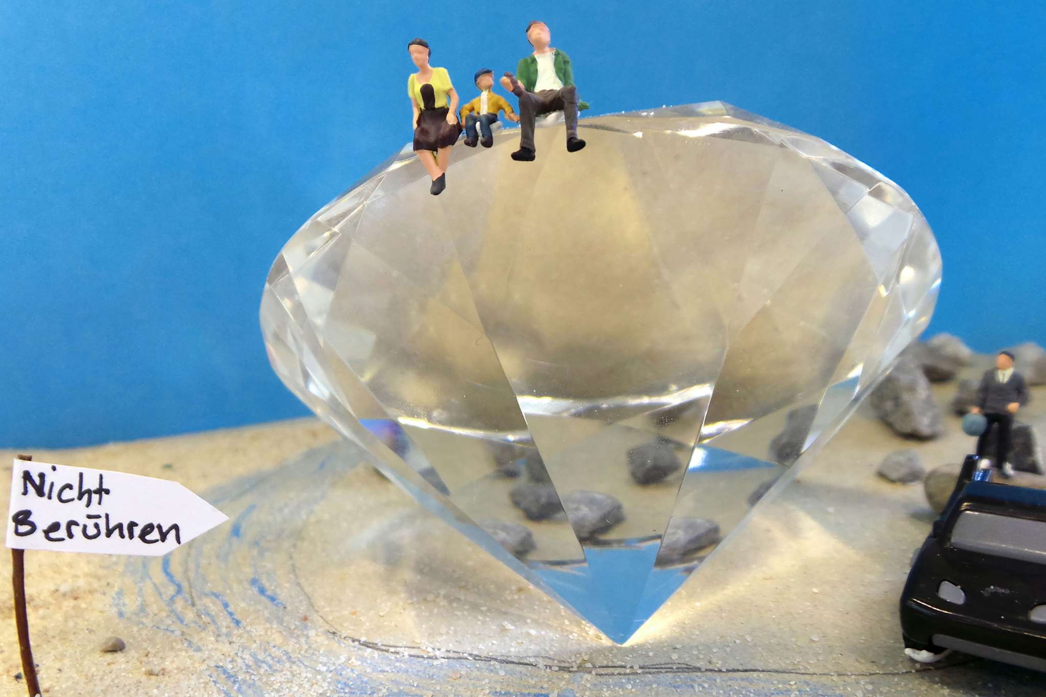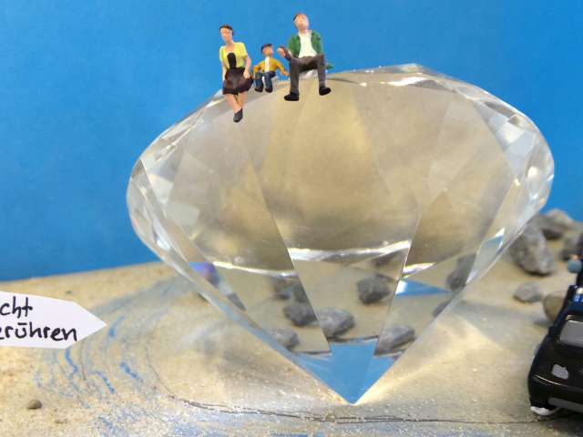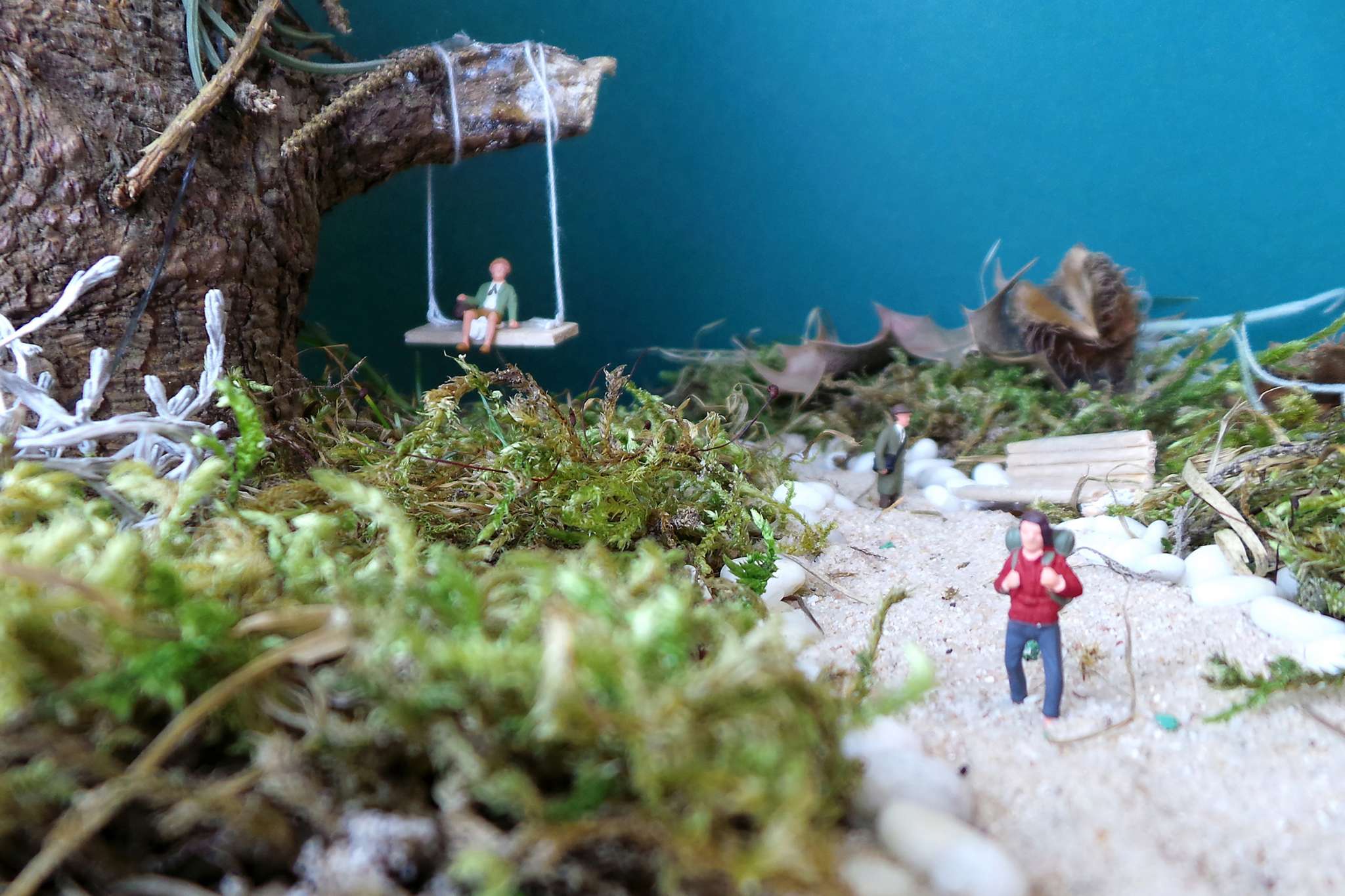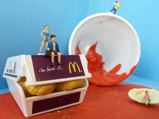 Rund um Minifiguren werden im Atelier Hintergründe und Requisiten hergestellt, eine Szene inszeniert und mit dem Handy fotografiert.