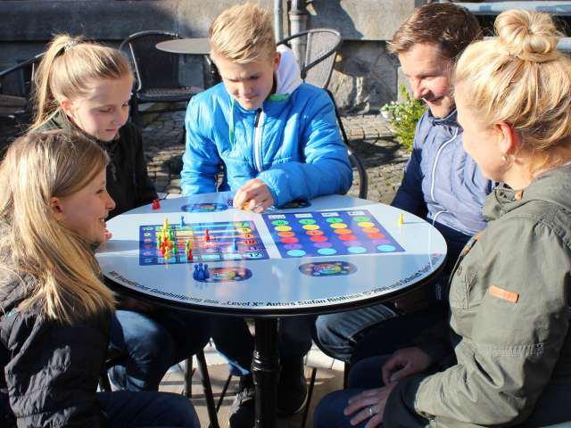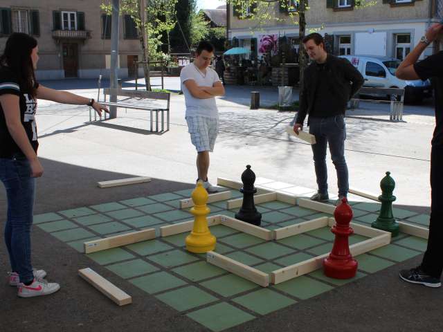 Führen Sie Ihre Spielfigur über den Dorfplatz, entschlüsseln Sie Wörter bei der Bibliothek, lösen Sie das rätselhafte Riesenpuzzle, finden Sie den Weg durch das Käse-Labyrinth, spielen Sie das grosse Leiterlispiel im Park, testen Sie Ihre Augen beim Augenmemo vor dem Optiker oder gewinnen Sie beim Frosch-Wetthüpfen auf der Treppe.