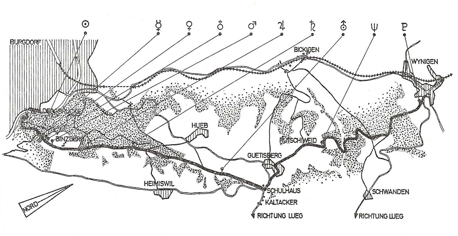 Burgdorf - Waldeggbrügg - Binzbergplateau (653 M.ü.M. , Beginn Planetenweg) - Kaltacker - Guetisberg - Rutschiweid - Wynigen.