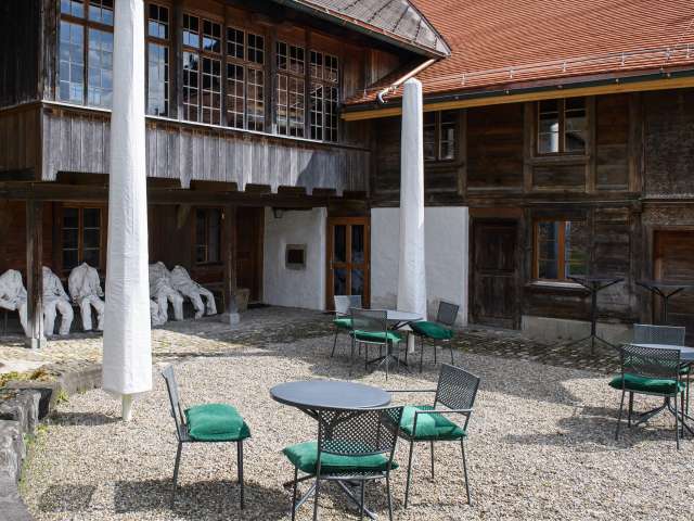 Das Museumskaffee ist eine kleine, aber feine Selbstbedienungsecke. Das Kaffee und «Öppis zum Schnouse» kann am langen Holztisch oder im schmucken Museumshöfli genossen werden und wird in ein Kässeli einbezahlt.