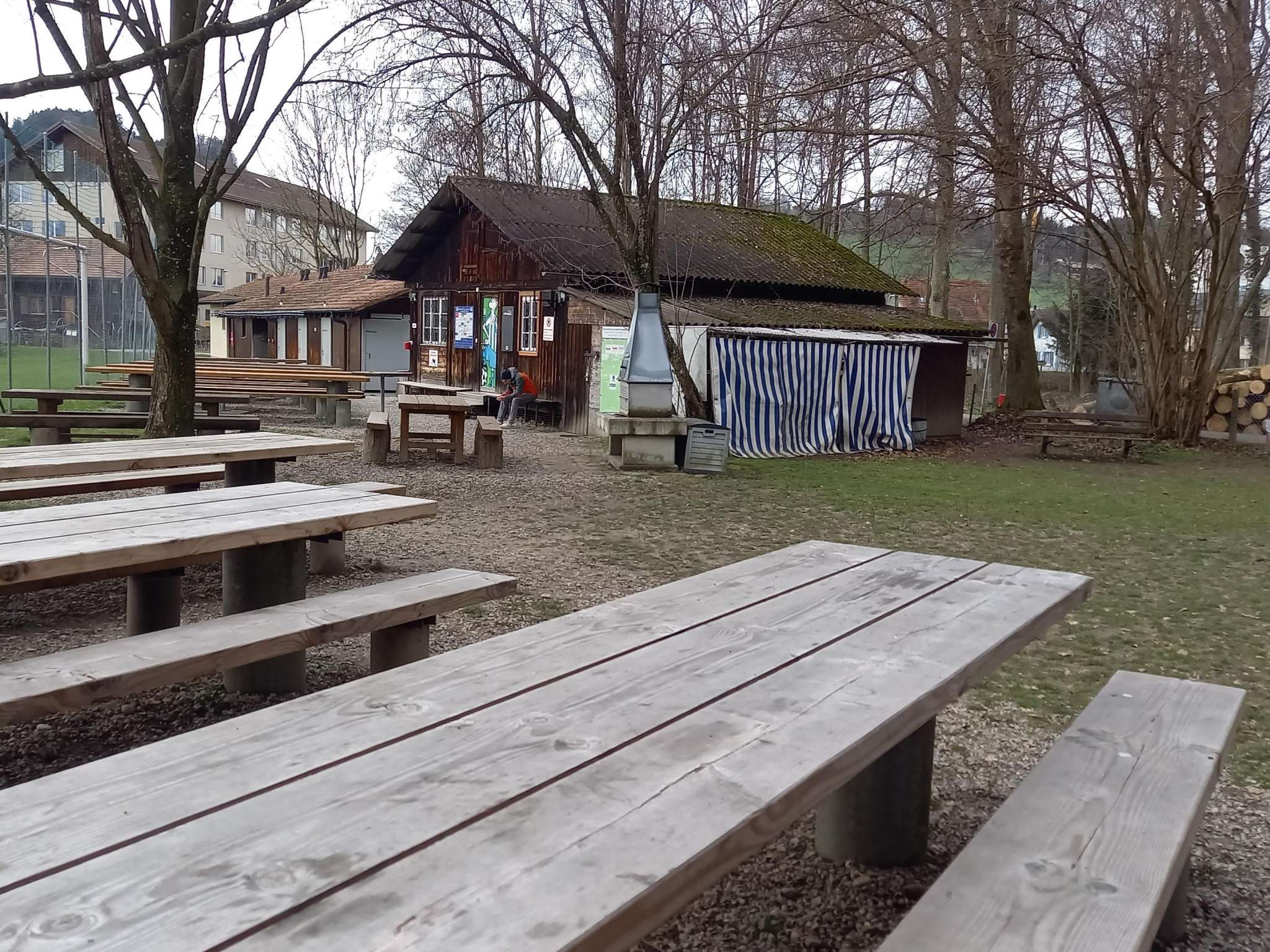 Während die Kinder sich auf dem Spielplatz austoben, finden Erwachsene Sitzgelegenheiten mit Picknicktischen unter schattigen Bäumen.