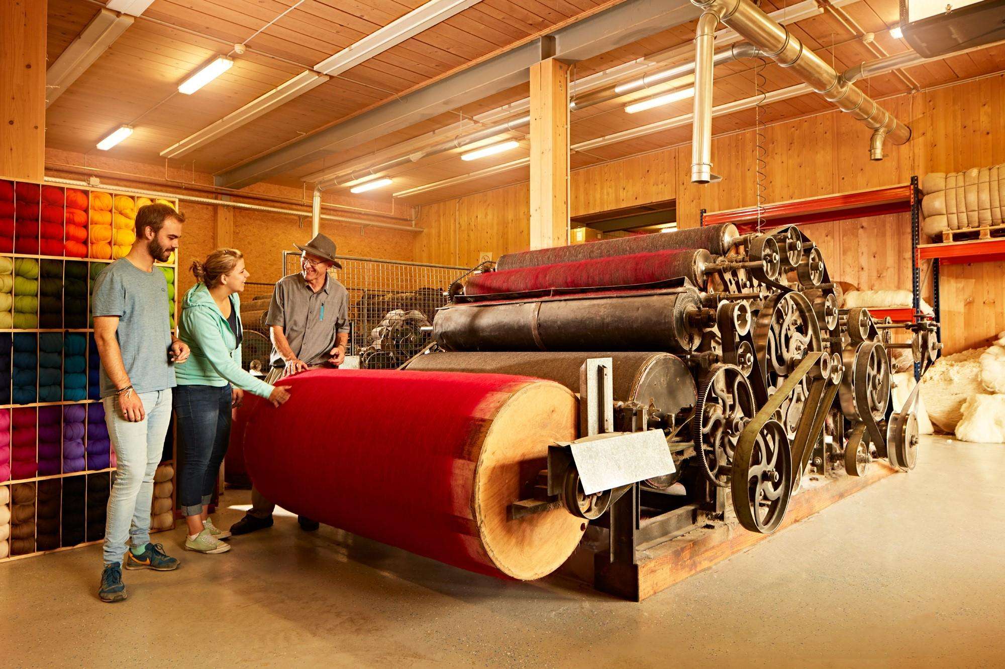 Als roter Faden führt der «Weg der Wolle» durch den gesamten Betrieb und informiert über das vielfältige Thema rund um den Rohstoff Wolle. Wo kommt die Wolle her? Wie wird Wolle verarbeitet? Was wird alles aus Wolle hergestellt?